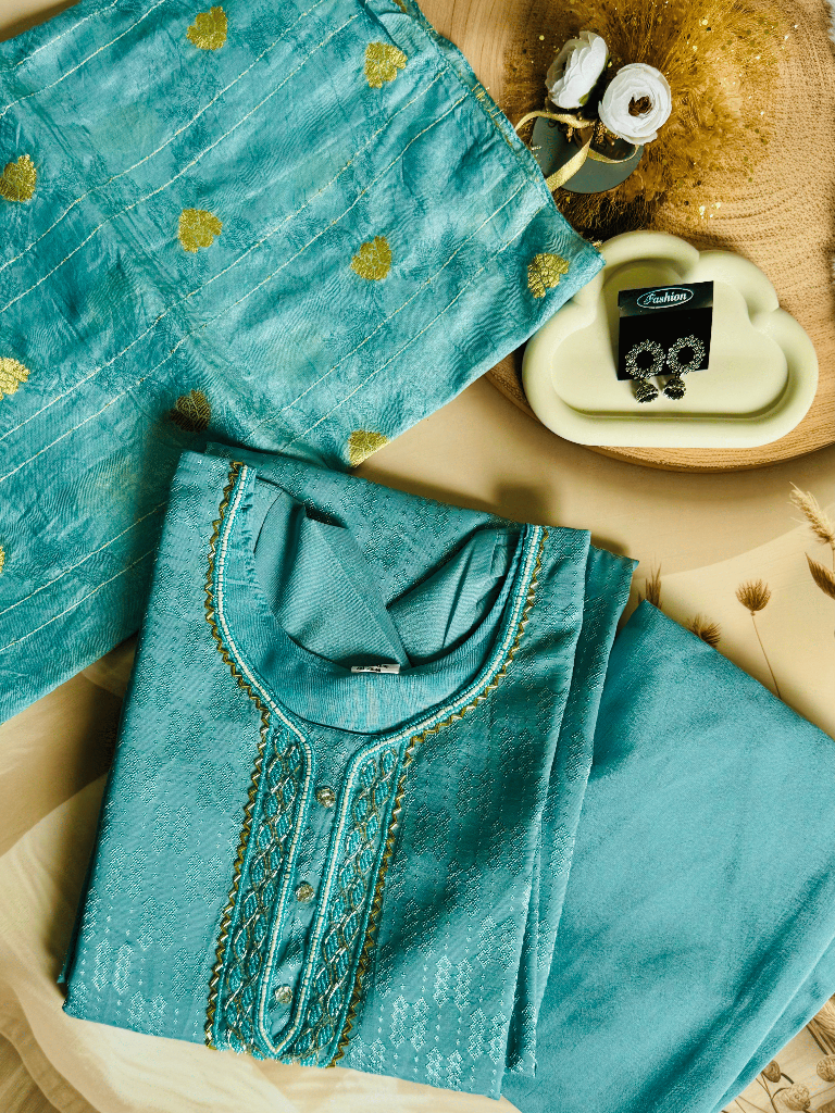 Elevate your ethnic wardrobe with our Aqua Bloom Kurta Set, a perfect blend of elegance and comfort. Crafted from premium-quality fabric, this set features a beautifully woven kurta adorned with delicate thread embroidery and subtle zari patterns. The rich teal hue is both refreshing and graceful, making it ideal for festive occasions, casual gatherings, or office wear.