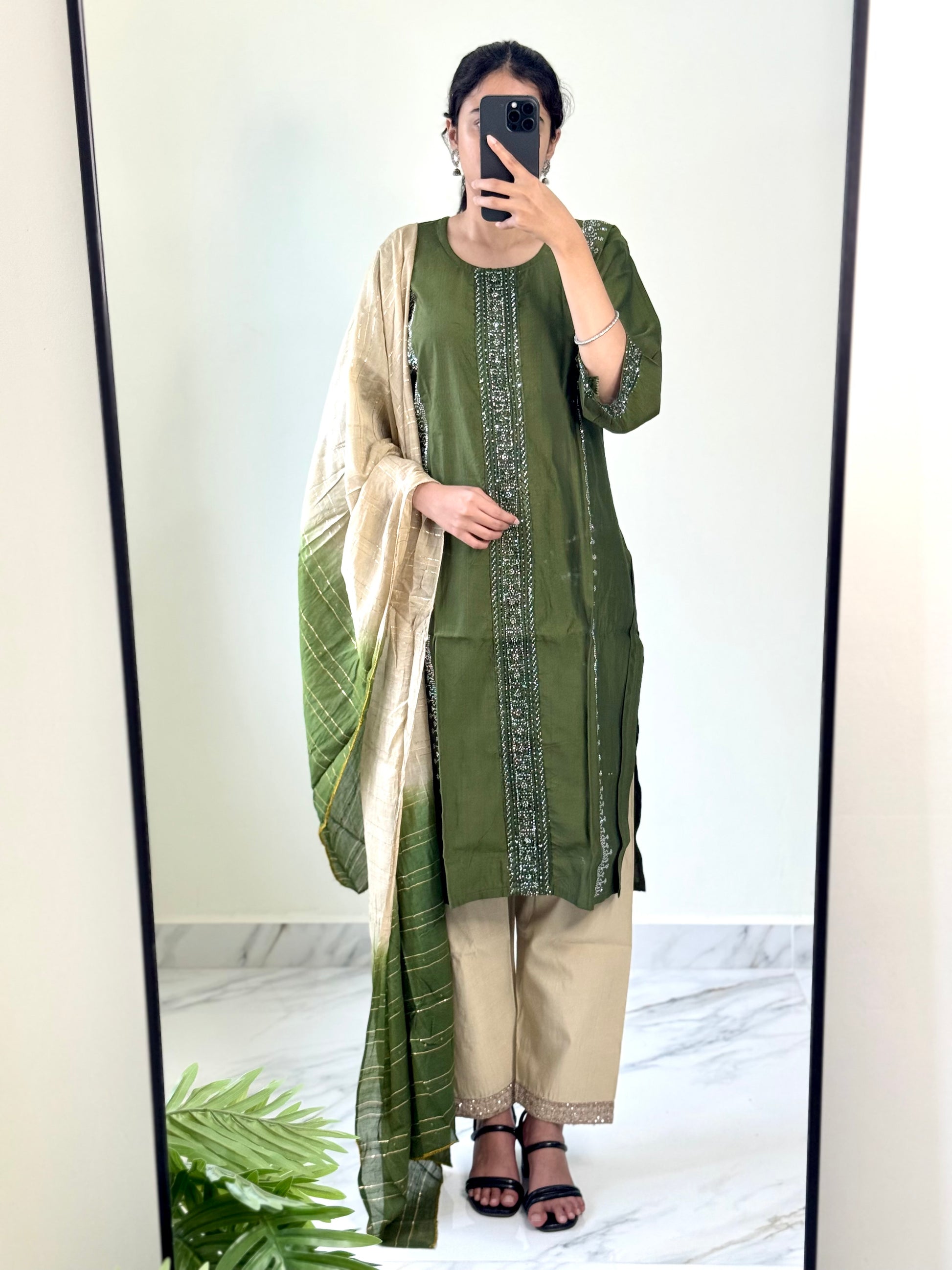 A graceful olive-green straight kurta with delicate vertical sequin embroidery that elongates the silhouette.